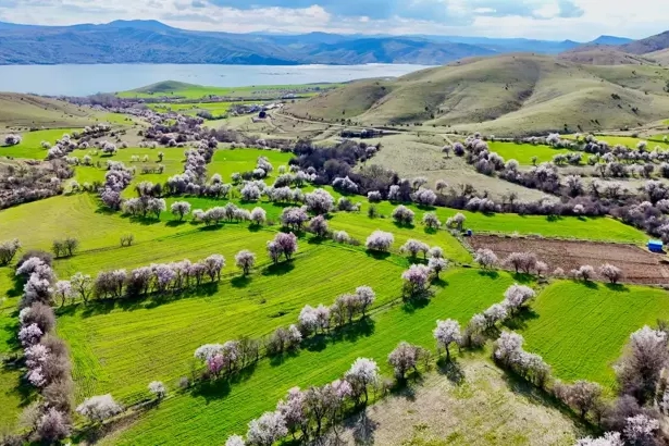 Pertek ilçesinde hava sıcaklıklarının artmasıyla badem ağaçları çiçek açtı. Beyaz ve pembe tonlara bürünen ağaçların oluşturduğu manzara, dron ile havadan görüntülendi.