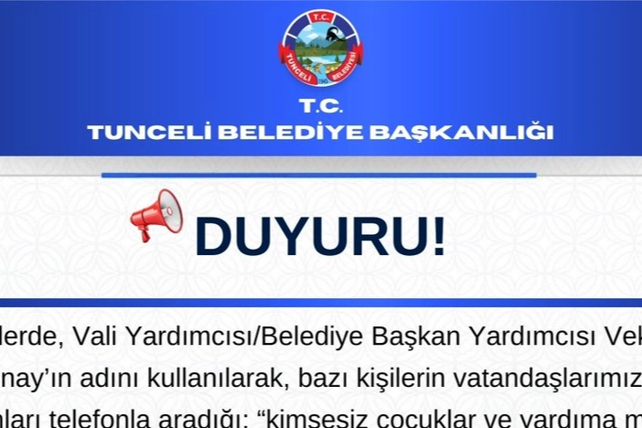 Söz konusu aramaların 0(505) 366 24 12 numaralı telefon üzerinden gerçekleştirildiği ifade edilirken, belediye yetkilileri bu tür taleplerin tamamen asılsız olduğunu vurguladı. Açıklamada, Tunceli Belediyesi’nin bugüne kadar hiçbir kişi ya da kurumdan bu şekilde bir yardım talebinde bulunmadığı ve bulunmayacağı ifade edildi.