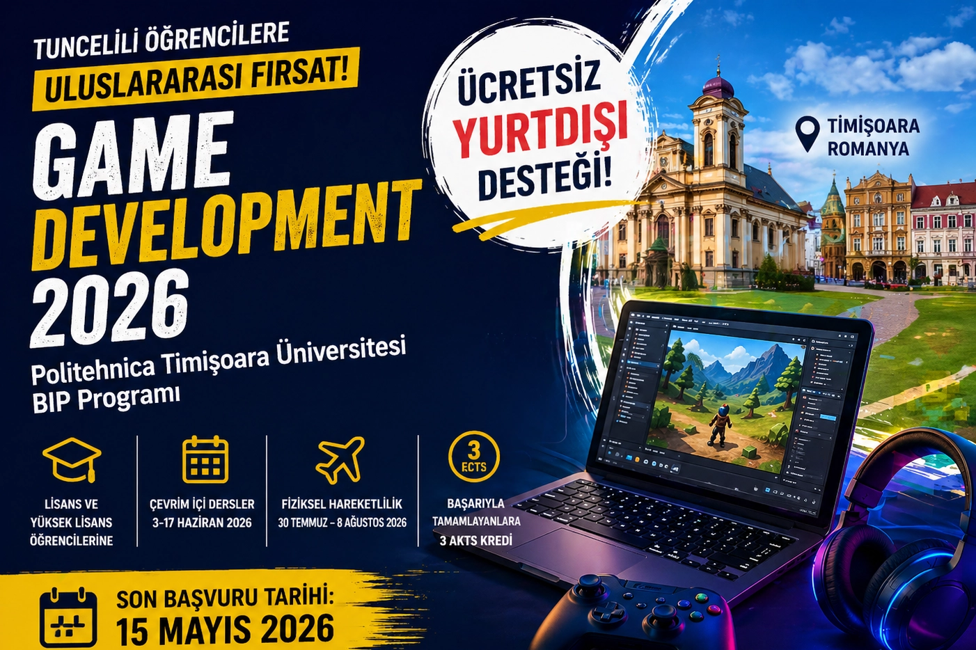 Romanya’da bulunan Politehnica Timişoara Üniversitesi tarafından düzenlenen “Game Development 2026” başlıklı Blended Intensive Programme (BIP), mühendislik ve bilişim alanlarında eğitim gören lisans ve yüksek lisans öğrencilerine uluslararası bir deneyim sunuyor.